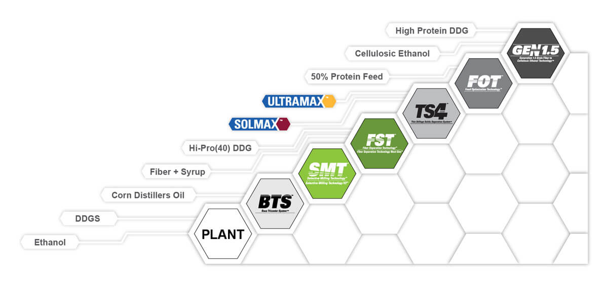 ICM has a long history of providing solutions focused on improving operations and opening up opportunities to create higher value products. In just the past decade, ICM has developed several technologies designed to improve the corn separation process, including Base Tricanter System™ (BTS™), Selective Milling Technology™ (SMT™) and Selective Milling Technology V2™ (SMTv2™), Fiber Separation Technology™ (FST™) and Fiber Separation Technology Next Gen™ (FST Next Gen™), Thin Stillage Solids Separation System™ (TS4™), and Fiber Optimization Technology™ (FOT™). See Figure 1.